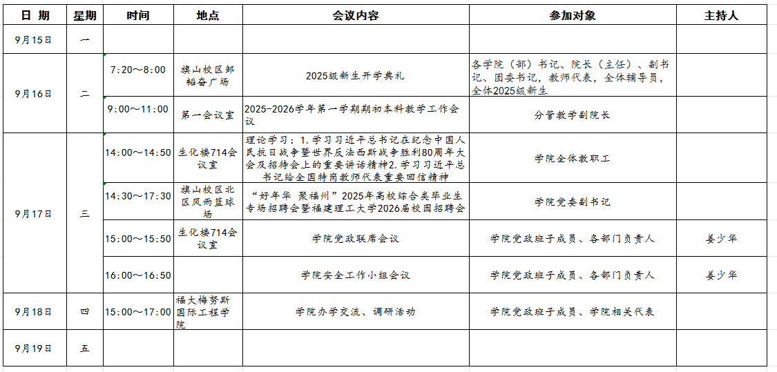 海外·帕特雷学院2025~2026学年第一学期第二周主要会议安排表(9月15日-9月21日)