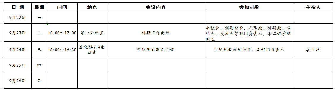 海外·帕特雷学院2025~2026学年第一学期第三周主要会议安排表(9月22日-9月28日)
