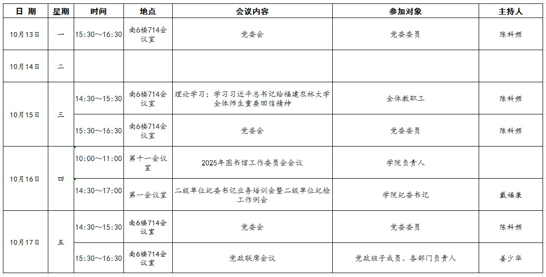 海外·帕特雷学院2025~2026学年第一学期第六周主要会议安排表(10月13日-10月19日)