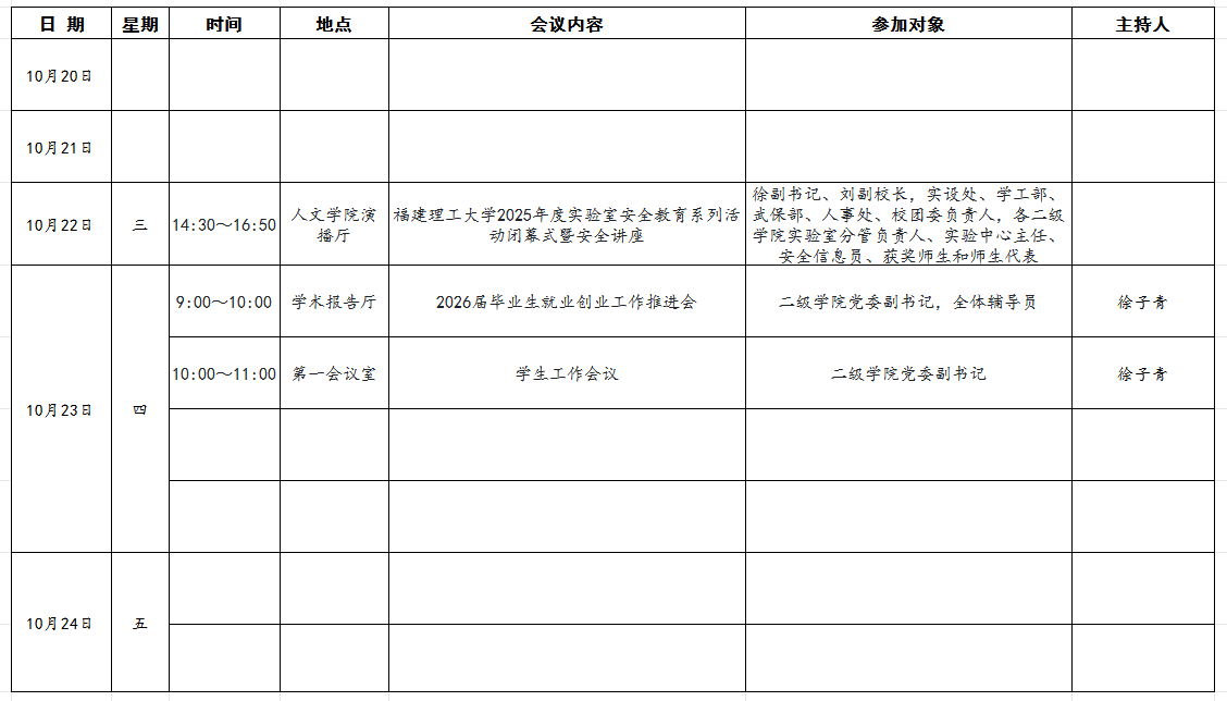 海外·帕特雷学院2025~2026学年第一学期第七周主要会议安排表(10月20日-10月26日)