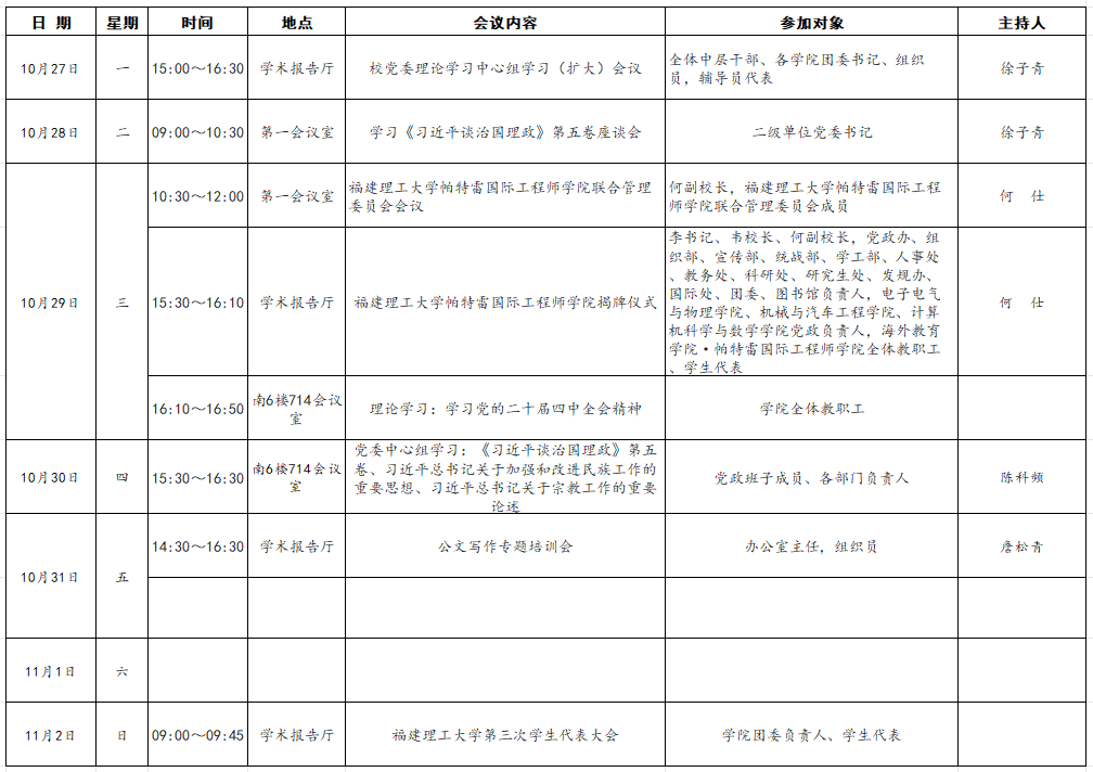 海外·帕特雷学院2025~2026学年第一学期第八周主要会议安排表(10月27日-11月2日)