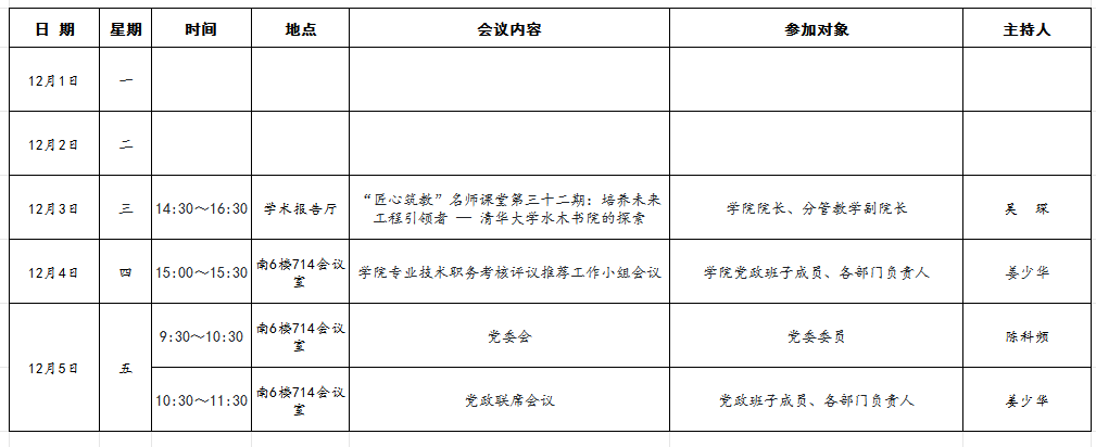 海外·帕特雷学院2025~2026学年第一学期第十三周主要会议安排表(12月1日-12月7日)