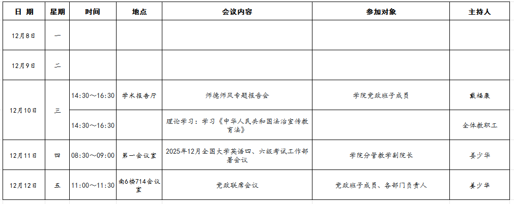 海外·帕特雷学院2025~2026学年第一学期第十四周主要会议安排表(12月8日-12月14日)