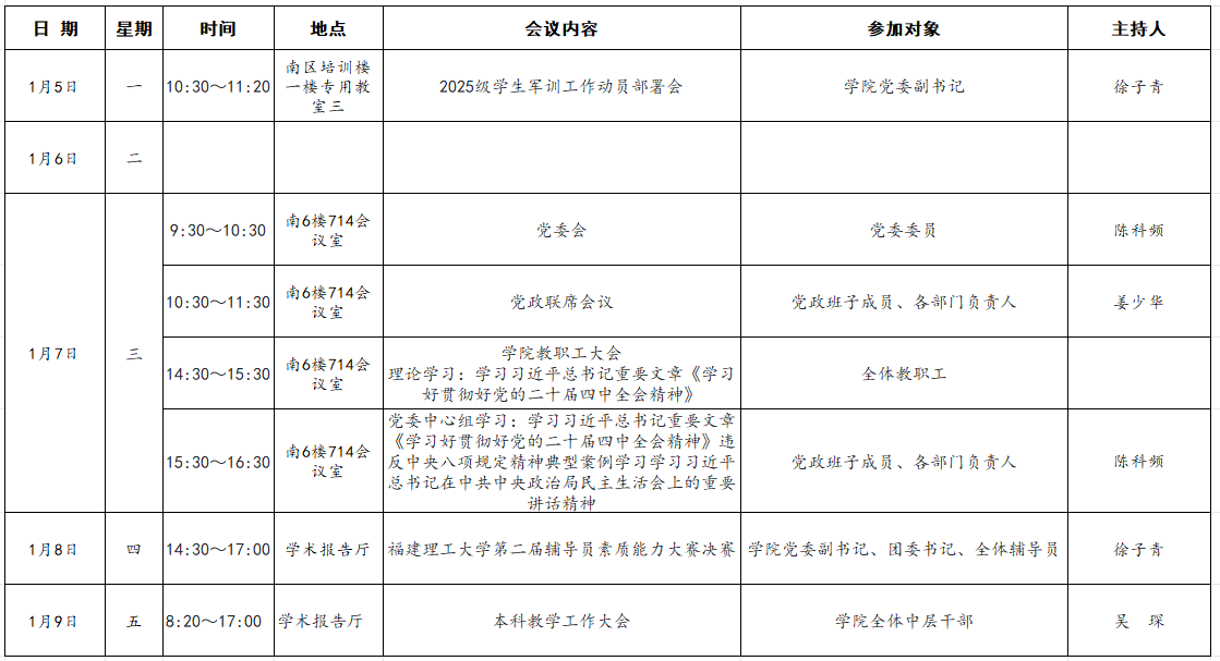 海外·帕特雷学院2025~2026学年第一学期第十八周主要会议安排表(1月5日-1月11日)