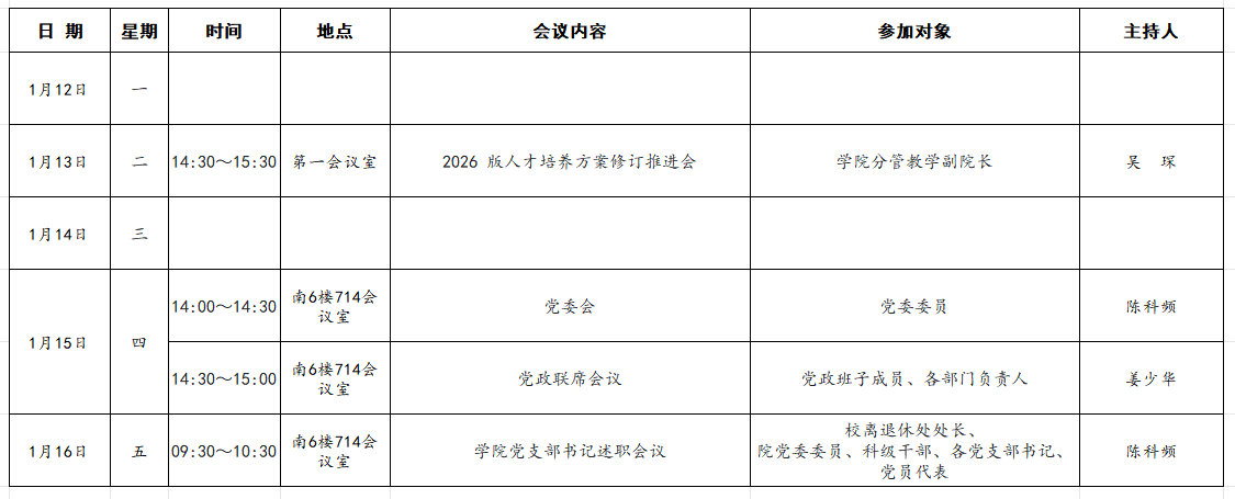 海外·帕特雷学院2025~2026学年第一学期第十九周主要会议安排表(1月12日-1月18日)