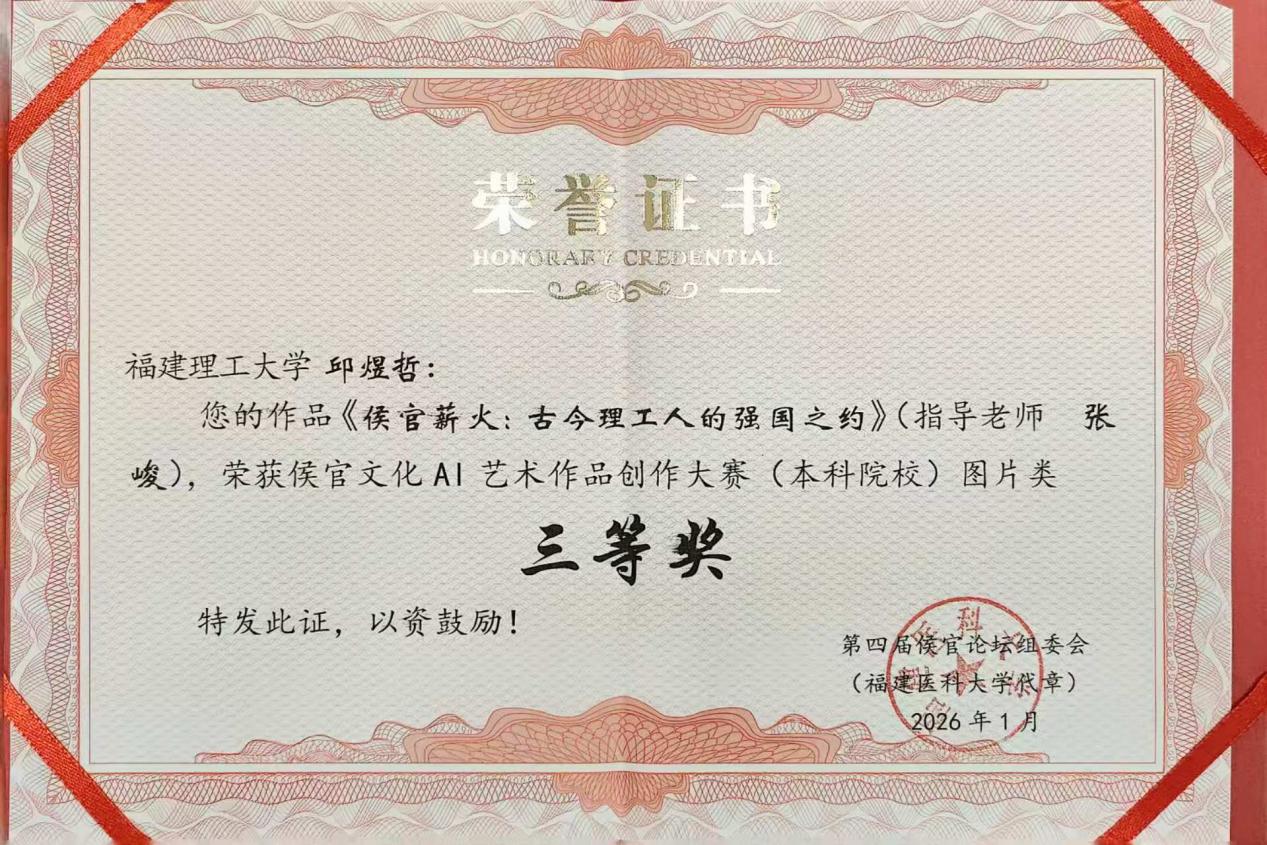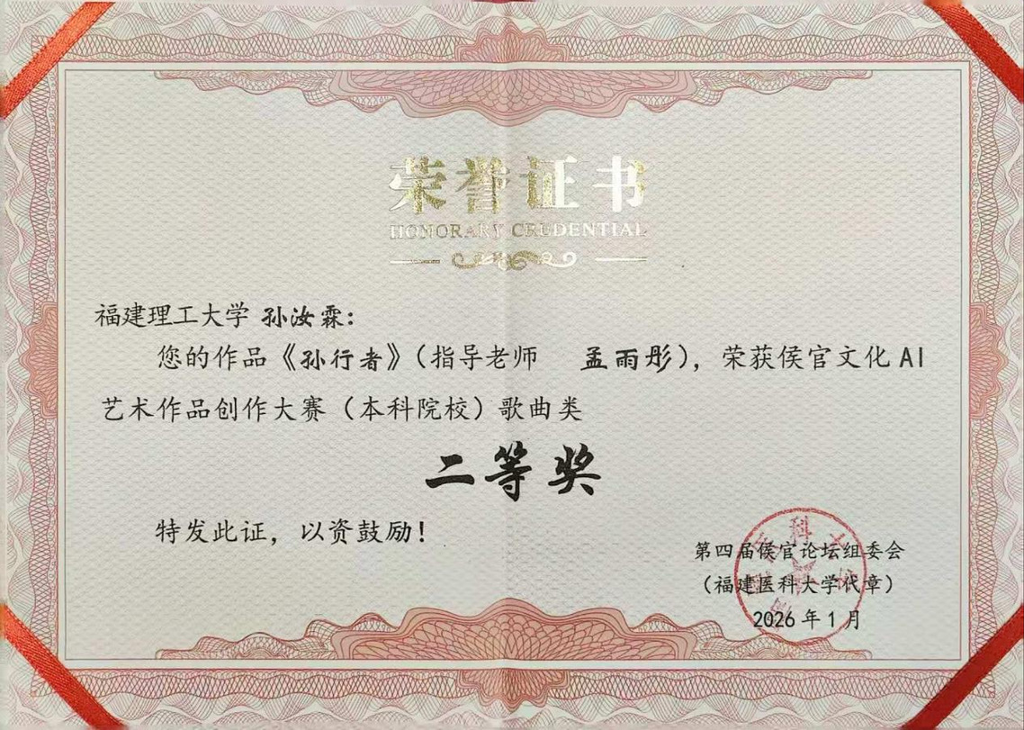 近日,由福建省教育厅指导、福建医科大学主办的福建省侯官文化AI艺术作品创作大赛圆满落幕。我院选送的2件作品脱颖而出,分别荣获本科歌曲类作品二等奖和图片类作品三等奖,展现了海外·帕特雷学子在AI艺术创作与文化传承融合方面的创新实力。