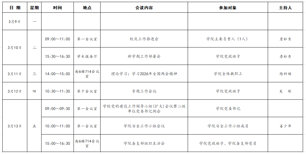 海外·帕特雷学院2025~2026学年第二学期第二周主要会议安排表(3月9日-3月15日)