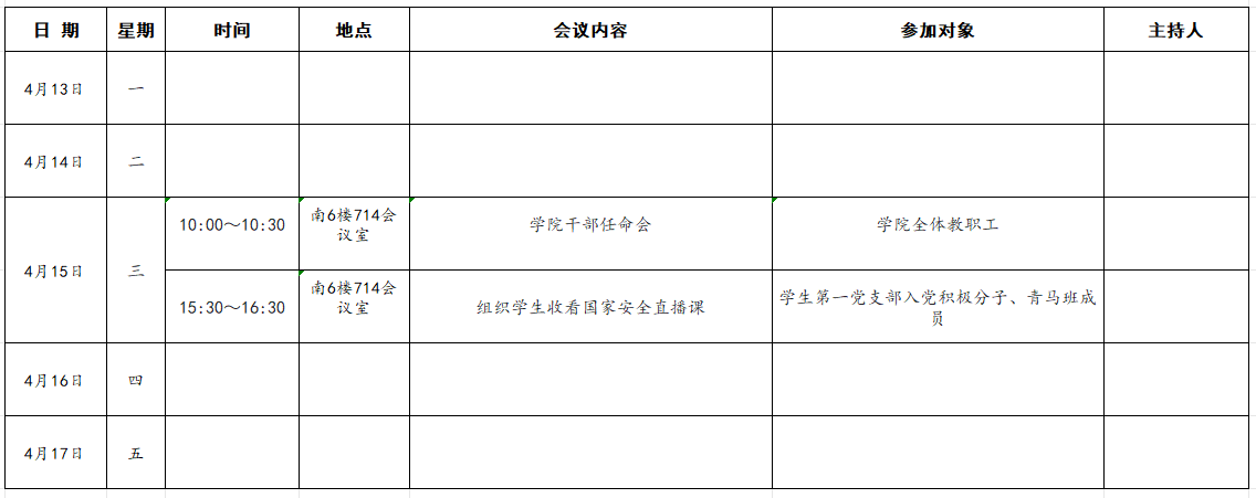 海外·帕特雷学院2025~2026学年第二学期第七周主要会议安排表(4月13日-4月19日)