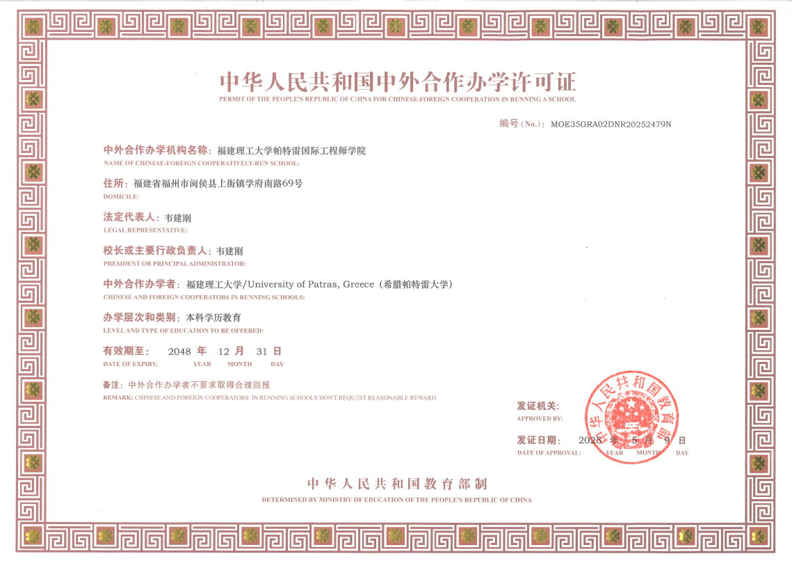 福建理工大学帕特雷国际工程师学院(Patras International Engineer Institute, Fujian University of Technology)于2025年5月经教育部批准设立(办学许可证编号:MOE35GRA02DNR20252479N)。学院由福建理工大学与希腊帕特雷大学合作举办,是隶属于福建理工大学的非独立法人中外合作办学机构,办学地点在福建理工大学旗山校区,设有土木工程(专业代码:081001H)、电气工程及其自动化(专业代码:080601H)、信息与计算科学(专业代码:070102H)三个本科专业,开展本科层次学历教育。